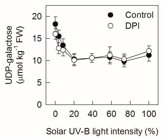 Concentrations of UDP-galactose in ‘Fuji’ apple peels after exposing bagged fruits, with or without DPI treatment, to diverse sunlight intensities. Each data point represents mean ± SE (n = 5).