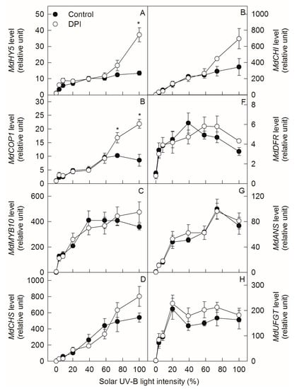Transcription levels of MdHY5 (A), MdCOP1 (B), MdMYB10 (C), MdCHS (D), MdCHI (E), MdDFR (F), MdANS (G), and MdUFGT (H) in ‘Fuji’ apple peels after exposing bagged fruits, with or without DPI treatment, to diverse sunlight intensities. Each data point represents mean ± SE (n = 5). The asterisk indicates a significant difference between DPI treatment and no DPI treatment at p < 0.05 (t-test).