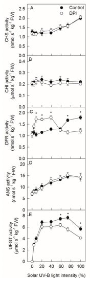 Activities of chalcone synthase (CHS, (A)), chalcone isomerase (CHI, (B)), dihydroflavonol 4-reductase (DFR, (C)), anthocyanidin synthase (ANS, (D)), and UDP-glycose: flavonoid 3-O-glycosyltransferase (UFGT, (E)) in ‘Fuji’ apple peels after exposing bagged fruits, with or without DPI treatment, to diverse sunlight intensities. Each data point represents mean ± SE (n = 5). The asterisk indicates a significant difference between DPI treatment and no DPI treatment at p < 0.05 (t-test).