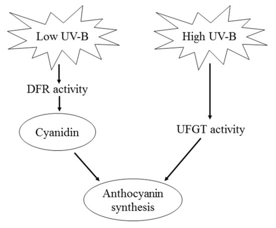 The synthesis of anthocyanins is involved in the phenylpropanoid metabolic pathway. Recently, the regulatory mechanisms of anthocyanin synthesis were reported [,,,,,,]. Sunlight is one of the environmental factors regulating gene expression and plant development, and ultraviolet-B (UV-B) is considered to be a major factor to increase the synthesis of anthocyanins and flavonoids in plants [,]. UV-B induced photomorphogenesis is initiated by the specific photoreceptor, UV RESISTANCE LOCUS 8 (UVR8), which utilizes its tryptophan residue as an internal chromophore to sense UV-B []. UVR8 regulates the light signaling factors E3 ubiquitin ligase CONSTITUTIVELY PHOTOMORPHOGENIC1 (COP1) and bZIP transcription factor ELONGATED HYPOGOTYL5 (HY5) [,]. When COP1 and HY5 are combined with the MYB transcription factor, they regulate anthocyanin accumulation [,,].