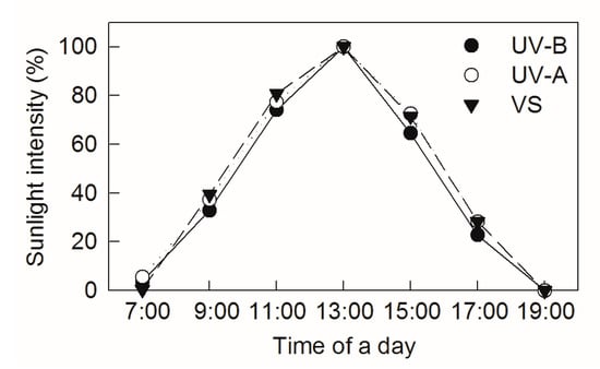 An external solar electric quantum meter (Spectrum Technologies Company, Chicago, Illinois, USA) and an ultraviolet radiometer (Instrument Factory of Beijing Normal University, Beijing, China) were used to measure visible and ultraviolet light transmittance, respectively. The data were collected at 07:00, 09:00, 11:00, 13:00, 15:00, 17:00, and 19:00 h in an open place on a sunny day. The strongest solar light intensity, recorded at 13:00, was 1800 ± 50 μmolm−2 s−1 photon flux density and set as 100% (Figure 7). The air temperature and humidity were 28 ± 1 °C and 45%, respectively, at midday during the treatments.