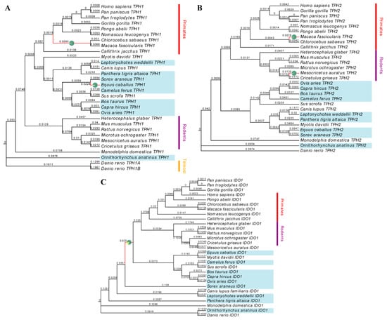 Phylogenetic trees of TPH1, TPH2 and IDO1 genes. The phylogenetic trees of TPH1, TPH2 and IDO1 genes are shown in (A), (B) and (C), respectively. The number on each branch represents the relative length of the branch. Colored bars and text describe the brief classification of species. The species with the blue background are seasonal breeders, while those without background are annual breeders or are not well defined. The red branches show that these lineages have a significant positive selection (p < 0.05). The pies of red branches show the proportion of positive selection sites (the yellow part) and non-positive selection sites (the green part) over the entire sites.