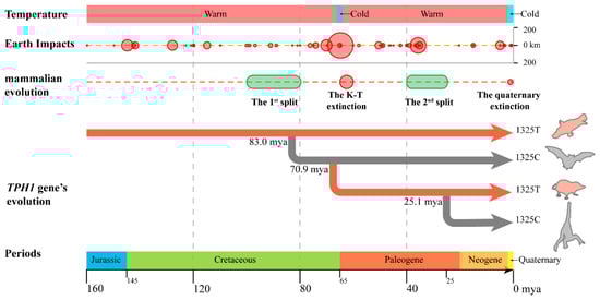 The platypus is the oldest and the most ancient mammal that still exists today; it appeared at the end and the warmest time of the Cretaceous (145.0–165.0 mya) []. After millions of years, it has neither gone extinct nor evolved significantly. The platypus is a seasonal reproducing mammal. The base at 1325th site of the TPH1 coding sequence is T in the platypus, suggesting the base at this site in mammals may be T at first and the T base may control seasonal reproduction in platypus. The base at 1325th site changed from T to C and spread in ancestors of rodents (mainly non-seasonal reproduction animals) about 83.0 mya (Figure 2A), which coincided with the time of the first major split events in mammals (100.0–85.0 mya) []. During this period, the first split event of mammalian species occurred, and the ancestors of many existing species appeared, such as hamsters, rabbits, goats and sheep (all about 96.0 mya). The disappearance of seasonal reproductive characteristics is conducive to more offspring and a rapid expansion of population size.