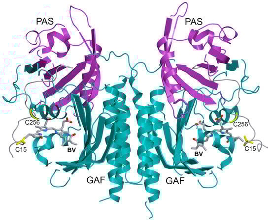 Three-dimensional (3D) structure of the chromophore-binding domain of bacterial phytochrome RpBphP2 (PDB: 4E04 [30]) assembled with its natural ligand, biliverdin IXα (BV). The location of the BV chromophore and cysteine (Cys15)/C256 is shown in sticks. PAS and GAF domains are marked in purple and cyan, respectively. The N-terminal extension of PAS domain is indicated in gray. The drawing was made using the graphic software VMD [31] and Raster3D [32].