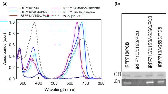 iRFP713/V256C/PCB and iRFP713/C15S/V256C/PCB enclose the covalently attached chromophore, as confirmed by zinc-induced fluorescence of the bands corresponding to the target proteins following separation of protein samples by SDS-PAGE (Figure 2b). The absorption spectrum of iRFP713 in the apoform had absorption bands with maxima at 405 nm and 690 nm (Figure 2a), which indicated the presence of the protein assembled with protoporphyrin IX (PPIX) [36] and BV [28]. PPIX- or BV-bound holoprotein impurities were not detected in the samples of iRFP713/V256C, iRFP713/C15S/V256C, and iRFP713/C15S apoproteins, as evidenced by the absence of absorption bands in the visible spectral region. Since we used the same protocols for purification of iRFP713 in the apoform and in the PCB-bound form, the sample of iRFP713 assembled with PCB is evidently not free of the PPIX- and BV-bound holoproteins. Still, these PPIX- and BV-bound holoprotein impurities contributed little to the zinc-induced fluorescence of iRFP713/PCB (Figure S1). These data argue for a covalent linkage between the PCB ligand and the Cys15 residue in iRFP713 (Figure 2b). iRFP713/C15S, lacking the conserved Cys15 residue, forms a fluorescent complex with PCB in which the chromophore is integrated into the chromophore-binding pocket of the protein but is not covalently linked (Figure 2b).