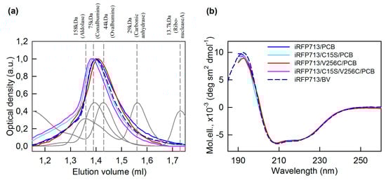 Spatial structure of the iRFP713 variants assembled with PCB. (a) Gel filtration of the iRFP713 variants assembled with PCB (the color of the lines is the same as in panel b). The elution profiles of the proteins with known molecular mass used for the column calibration are shown in gray. (b) Secondary structure of the cofactor bound iRFP713 variants is tested by far-UV CD. The elution profile on the panel (a) and the far-UV CD spectrum on the panel (b) of iRFP713/BV are shown as well.