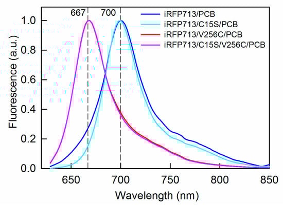 The fluorescence spectra of iRFP713/V256C/PCB and iRFP713/C15S/V256C/PCB coincided well and had maxima at 646 nm (Figure 5 and Table 3). The fluorescence spectra of iRFP713/PCB and iRFP713/C15S/PCB were red-shifted relative to those of iRFP713/V256C/PCB and iRFP713/C15S/V256C/PCB (Figure 5 and Table 3). A slight red shift of 2 nm in the fluorescence spectrum of iRFP713/PCB relative to the fluorescence spectrum of iRFP713/C15S/PCB was detected (Figure 5 and Table 3). The excitation at 560 nm revealed a small shoulder with a maximum at 622 nm in the fluorescence spectrum of iRFP713 (Supplementary Figure S4), which arises from the PPIX-conjugated holoprotein [49].
