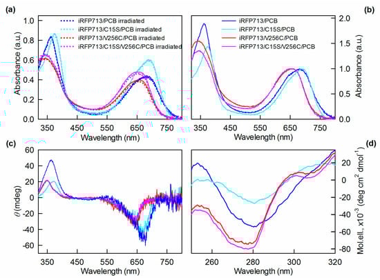 The configuration of PCB incorporated into the iRFP713 variants. (a) The absorption spectra of the iRFP713 variants followed the denaturation under acidic conditions. The measurement was performed before (solid lines) and after irradiation with red light (dotted lines). (b) The absorption spectra of the iRFP713 variants denatured under acidic conditions normalized to unity at the maximum of the PCB Q absorption band. The visible and near-UV CD spectra of the proteins are shown on the panels (c) and (d), respectively.
