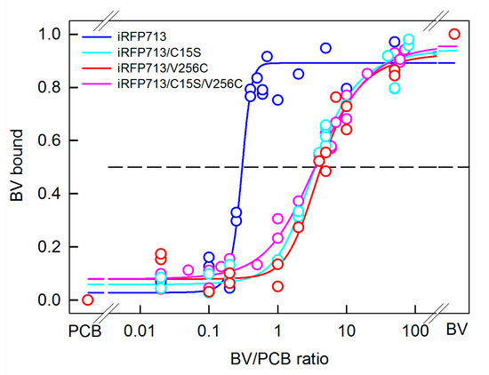 Competing PCB and BV for apoproteins of iRFP713 and its mutant variants. The contribution of BV and PCB assembled with the analyzed proteins to their absorption is determined as described in the “Materials and Methods” section. The dashed line indicates the 50% saturation of the analyzed proteins with BV. The experimental data and their approximation are shown by circles and solid lines, respectively.