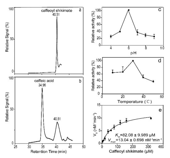 2.5. LkCSE Converts Caffeoyl Shikimate to Caffeate and Shikimate