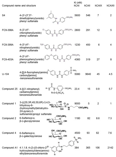 Chemical structures and Ki values for CAI, CAII, CAIX and CAXII for ureidosulfamates S4, FC9-398A, FC9-399A and FC9-403A, ureidobenzenesulfonamides U-104 (SLC-0111) and compound 25, carbohydrate-based sulfamate compounds 1, 2 and 4 and sulfonamide A1.