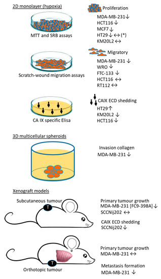 Carbonic anhydrases (CA, EC 4.2.1.1) catalyse the reversible hydration of carbon dioxide to bicarbonate and protons [H2O + CO2 ↔ HCO3− + H+]. The human alpha carbonic anhydrase family contains fifteen isoforms, three of which lack CA activity, of which the majority is expressed in all tissues/cells. The expression of CA isoform IX in normal tissues is restricted to the basolateral membrane of epithelial cells of the gastric, intestinal and gallbladder mucosa [1]. The expression of CA XII in normal tissues is much more widespread. In solid cancers, the upregulation of CA isoforms IX and XII is closely associated with hypoxia—the oxygen deprivation of cancer cells due to the combination of a poor tumour vascularisation and a high proliferation rate [2,3]. The overexpression of transmembrane proteins CAIX and CAXII in cancer tissues is associated with multiple markers of cancer progression including high tumour growth, tumour cell migration, infiltration of surrounding normal tissues and the formation of metastases [2,3,4]. There is a well-established role of CAIX in facilitating migration and invasion of cancer cells. Conditional shRNA-mediated silencing of CA9 gene in HT-1080 (fibrosarcoma) cells, reduced the expression of proteins such as protein kinase 1 (ROCK1) involved in focal adhesions (FAs). Silencing of CA 9 gene affected the assembly of these highly dynamic and multicomplex protein structures attached to the plasma membrane, resulting in a significant reduced spreading, migration and invasion of Matrigel [5]. In lamellipodia, membranous protrusions at the leading edge of migrating cells that provide direction to the cell movement [6], CAIX colocalised with paxillin in FAs [7]. CAIX is also an important component of invadopodia, F-actin-rich protrusions of the plasma membrane involved in extracellular matrix (ECM) proteolysis and invasion [6]. Swayampakula and colleagues demonstrated, using a proximity-dependent labelling approach in proteomics study (BiolD), that CAIX associates with β1 integrins and matrix metalloproteinase 14 (MMP14), both components of invadopodia. CAIX stimulated the activation of MMP14 by supplying protons required for MMP14 catalytic activity, enhancing the degradation of type I collagen and stimulating MDA-MB-231 (breast carcinoma) invasion [8]. CAIX expression is controlled by hypoxia/Hypoxia Inducible Factor 1 (HIF-1) via the binding of this transcription factor to the Hypoxia-Response Elements (HREs) in the 5’-upstream genomic region of CA9 gene [3]. HIF-1 is a heterodimer that consists of a constitutively-expressed beta subunit (HIF-1β) and a hypoxia-induced alpha subunit (HIF-1α). In hypoxic conditions, HIF-1α is stabilised, allowing for HIF-1 activity to increase and stimulate the expression of various genes including CAIX. CAXII expression is also associated with the hypoxic environment in solid tumours despite the fact that HREs are essentially lacking in the 5’-upstream genomic region of CA12 gene [2]. The role of CAXII in the interaction between the tumour cell and ECM is less well known and has not been linked with FAs. However, selective silencing of CA12 gene in MDA-MB-231 cells (MDA-MB-231-siCAXII), interfered with the p38 mitogen-activated protein kinases (p38 MAPK) signalling pathway, which resulted in decreased cell migration and Matrigel-invasion [9]. Orthotopic tumours derived from MDA-MB-231-siCAXII cells were less metastatic than control cells. Silencing of the Hedgehog signaling pathway in MDA-MB-231 cells reduced CAXII expression and migration, which highlighted a potential role of CAXII in cancer cell migration [10].