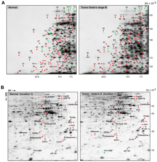 Tissue biopsies were divided and matched, according to Dukes’ stage of tumors as well as the sampling site. The site of sampling was recorded to ensure broad coverage, given that right- and left-sided neoplasms (proximal and distal to the splenic flexure) are considered distinct tumor entities, initiated by two different genetic mechanisms, microsatellite instability (MSI) and chromosomal instability (CIN), which contribute to carcinogenesis in the proximal and distal segments of the large bowel, respectively [30,31]. Proteome expression profiles of matched normal/tumor colon tissue pairs were analyzed using 2D PAGE in combination with mass spectrometry and database matching. Representative NEPHGE 2D gels for a normal sample (location 1) and a matched primary tumor (Dukes’ B, location 1) are shown in Figure 1A. For each case, differentially expressed proteins were pinpointed by image analysis and proteins recovered from silver-stained 2D gels were identified by MALDI-TOF-MS. A representative 2D IEF gel set of a normal sample (location 1) and its matched primary tumor (Dukes’ A, location 1) are shown in Figure 1B with differentially overexpressed proteins highlighted. In the combined NEPHGE and IEF analysis, we identified 63 consistently upregulated polypeptides (factor of four-fold or more, across multiple samples) that represented potential CRC biomarkers for early detection (Table 1).