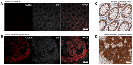 - Jin, S.; Mu, Y.; Wang, X.; Liu, Z.; Wan, L.; Xiong, Y.; Zhang, Y.; Zhou, L.; Li, L. Overexpressed RACK1 is positively correlated with malignant degree of human colorectal carcinoma. Mol. Biol. Rep. 2014, 41, 3393–3399. [Google Scholar] [CrossRef]