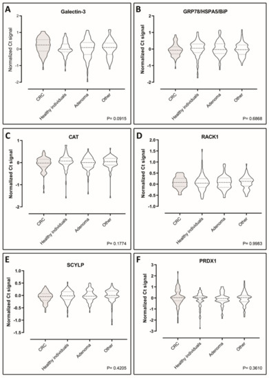 Violin plots showing comparisons of the plasma levels of six biomarkers—(A) galectin-3, (B) Grp78, (C) Cat, (D) Rack1, (E) Scylp, and (F) Prdx1—between CRC patients, healthy individuals, adenoma patients, and patients with diseases other than cancer (70 case-control sample set). Data are presented as Ct normalized signals measured for each protein in all four groups. The p-values were determined using ANOVA statistical tests. Mean values are indicated by horizontal bars. CRC sample plots are grey-shaded, all others are white.