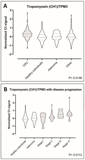 We analyzed tumor and site-matched normal tissues from patients with different tumor localizations and Dukes’ stage (Table 4 and Table 5, Figure S2), and identified 63 consistently upregulated polypeptides (factor of four-fold or more) in the combined NEPHGE and IEF analysis (Table 1). Several of these proteins, such as elongation factor 1-γ, profilin-1, annexin III, α-enolase, and Rack1, have previously been found in other studies to be associated with CRC [34,35,36,37]. We selected 10 out of the 63 consistently upregulated polypeptides that were identified (Table 2), and performed an exploratory study to verify the presence of the ten candidate biomarkers in human plasma. We established quantitative assays to measure the levels of each of the ten biomarkers in plasma, of which seven could be deployed. Following a first level analysis of the seven biomarkers, protein levels were analyzed by PEA in plasma samples from a cohort of 280 people, including healthy individuals with or without adenomas, CRC patients, and patients with non-cancer diseases (Figure 3 and Figure 4). One single protein, Tpm3, could discriminate CRC at a significant level (p = 0.0146) (Figure 4). Tpm3 is an actin-binding protein expressed in skeletal and smooth muscles and some non-muscular tissues. TPM3 expression has been reported to control migration, invasion, and anchorage-independent growth of cancer cells by modifying the epithelial-mesenchymal transition pathway [38,39,40]. Moreover, a functional transformation screen performed with a cDNA library derived from a colorectal cancer biopsy has identified a chimeric “TPM3-TRK” fusion oncogene. This oncogene was the result of an intrachromosomal rearrangement that caused the fusion of the TPM3 gene with a sequence encoding the transmembrane and intracellular domains of a transmembrane tyrosine kinase, TRK (tropomyosin receptor kinase) [41,42].