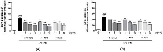 2.4. Peptides of Dehydrated Chips Reduced Cycloxygenase-2 (COX-2) and Inducible Nitric Oxide Synthase (iNOS) Expression in LPS + IFN-Stimulated IEC-6