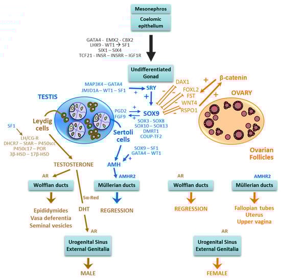The ground-breaking observations made by Jost almost seventy years ago [56] taught us that the differentiation of the gonadal ridges into testes is determinant for the virilisation of the foetus. This is due to the fact that the testes have two endocrine cell populations: Leydig cells produce androgens, which induce the differentiation of the Wolffian duct into the epididymis, vas deferens and seminal vesicles and the virilisation of the primordia of the external genitalia [57], and Sertoli cells secrete anti-Müllerian hormone (AMH), responsible for the regression of the Müllerian ducts, which otherwise form the Fallopian tubes, the uterus and the upper vagina [58,59] (Figure 1).