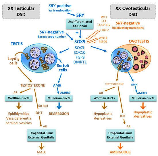 Ovarian differentiation and female internal and external genitalia are the expected pathway in the mammalian XX foetus (Figure 1). Only rarely, may XX gonads follow the testicular differentiation pathway, and consequently internal and external genitalia are virilised by testicular hormones. This “sex-reversal” condition was initially characterised in humans and named “XX male” [1], since no hint of a disorder of sex development was present until adulthood, when these males sought medical attention for infertility (see below). Alternatively, testicular tissue was also observed together with ovarian tissue in the same individual carrying an XX karyotype. The condition was known previously as “hermaphroditism”, and most frequently internal and external genitalia are ambiguous since the testicular moiety is functionally insufficient to induce full virilisation during embryonic and foetal development. Finally, virilisation of an XX foetus with ovarian development and absence of testicular tissue can be the consequence of an androgen excess of extragonadal origin. Indeed, disorders of adrenal steroidogenesis—like congenital adrenal hyperplasia [2], androgen-secreting adrenal or ovarian tumours or maternal use of anabolic steroids [3], and placental aromatase deficiency [4] can lead to foetal virilisation in the absence of testicular tissue. In this review, we will address only those conditions in which there is testicular differentiation despite an XX karyotype, with special emphasis in conditions affecting human individuals.