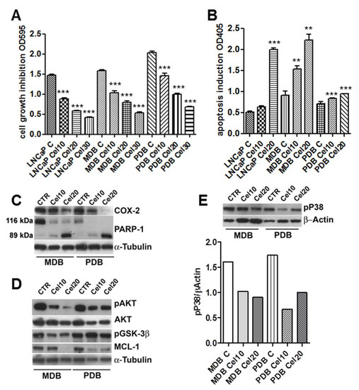 We know, from our previous studies and in agreement with findings on tissues from CRPC patients [10,12,13], that androgen-resistant cell survival is supported by the activation of two signaling pathways: AKT and p38MAPK (P38). We thus tested whether celecoxib could attenuate the activity of the anti-apoptotic kinase AKT. MDB and PBD cells were exposed to 10 and 20 μM celecoxib for 48 h and examined by Western blot for AKT activation. Figure 1D shows the impact of celecoxib treatment on phospho-AKT levels, the inhibition was particularly relevant in the MDB cell line. Under identical conditions pP38 activity was also modulated in MDB and PDB cells (Figure 1E).