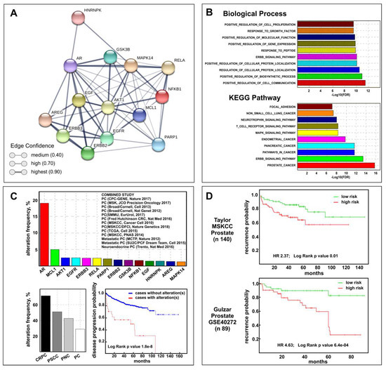 To understand the biological effects and mechanisms associated with the CGS, we performed gene ontology-biological process (GO-BP) and pathway enrichment analysis by CSEA. The top ten GO-BPs mainly concern mechanisms involved in response to external stimuli while prostate cancer pathways were found among the top ten KEGG pathways (Figure 5B). The combined STRING analysis of the CGS here identified and the 172 genes and/or proteins previously described as differentially expressed in MDB and PDB cells during castration resistance development [10] resulted in a high number of interactions and a highly significant protein–protein interaction (PPI) enrichment p-value (Figure S2A) mainly determined by AR and AKT1 (Figure S2B). With this premises, we verified the CGS clinical relevance by performing bioinformatics analyses on human prostate cancer genomic and transcriptomic datasets using respectively the cBioPortal and the SurvExpress Web resources. Cancer genomic analysis using 13 multidimensional prostate cancer data sets (Figure 5C) showed that significantly higher genetic alterations were observed for AR (19%) and MCL1 (5%) genes among the CGS. Of note, the prostate cancer subtype with the highest percent of CGS genetic perturbation was CRPC (71.4%) while only 28.9% was observed in PCa. Using the Kaplan–Meier method we found that genetic and mRNA expression alterations of the CGS are associated respectively with disease progression (Figure 5C) and recurrence (Figure 5D)-free survival for PCa patients.