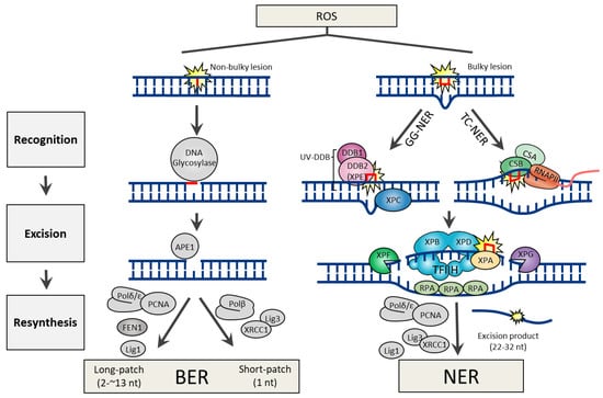 DNA lesions arising from the ROS attack can generate both non-bulky (non-helix distorting) and bulky (helix distorting) lesions. In human cells, BER and NER are the two DNA excision repair pathways responsible for the removal of non-bulky and bulky DNA lesions, respectively. Both repair pathways share three common steps, which include 1) lesion recognition, 2) excision of damaged nucleotide, and 3) resynthesis using error-free DNA polymerases (Figure 1).