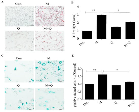 Quercetin can delay senescence of RAW264.7 cells and reduce the accumulation of intracellular lipid. (A) Oil red O staining. (B) Intracellular lipid deposition. (C) SA-β-gal staining. (D) Percentage of SA-β-gal positive stained cells. Con, control; M, model; Q, quercetin; M + Q, model + quercetin. Data are presented as means ± SD, * p < 0.05; ** p < 0.01.