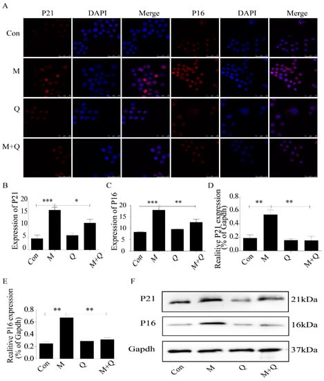 Expression of P21 and P16 in macrophage cells detected by immunofluorescence and Western blot. (A) Immunofluorescence. (B,C) Results of P21 and P16 immunofluorescence. (D,E) Results of P21 and P16 Western blot. (F) Western blot. Con, control; M, model; Q, quercetin; M + Q, model + quercetin. Data are presented as means ± SD, * p < 0.05; ** p < 0.01; *** p < 0.001.