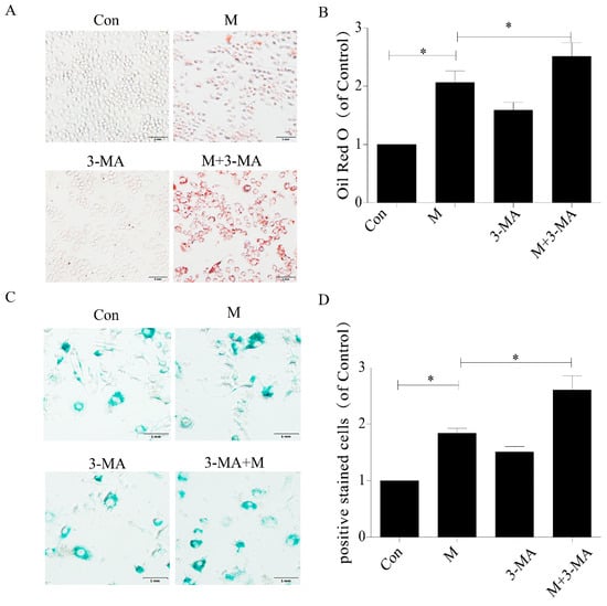 3-MA promoted senescence of RAW264.7 cells and aggravated accumulation of intracellular lipid. (A) Oil red O staining. (B) Intracellular lipid deposition. (C) SA-β-gal staining. (D) Percentage of SA-β-gal-positive stained cells. Con, control; M, model; 3-MA, 3-methyladenine; M + 3-MA, model + 3-methyladenine. Data are presented as means ± SD, * p < 0.05.