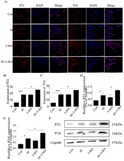 Expression of P21 and P16 in macrophage cells detected by immunofluorescence and Western blot. (A) Immunofluorescence. (B,C) Results of P21 and P16 immunofluorescence. (D,E) Results of P21 and P16 Western blot. (F) Western blot. Con, control; M, model; 3-MA, 3-methyladenine; M + 3-MA, model + 3-Methyladenine. Data are presented as means ± SD, * p < 0.05; *** p < 0.001.