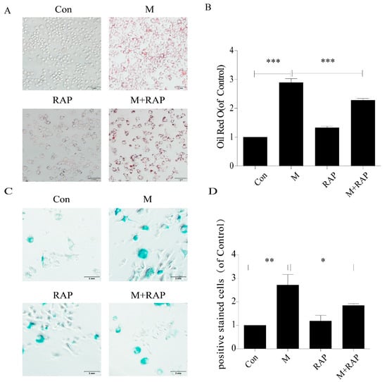 Rapamycin delayed senescence of RAW264.7 cells and reduced accumulation of intracellular lipid. (A) Oil red O staining. (B) Intracellular lipid deposition. (C) SA-β-gal staining. (D) Percentage of SA-β-gal-positive stained cells. Con, control; M, model; RAP, rapamycin; M + RAP, model + rapamycin. Data are presented as means ± SD, * p < 0.05; ** p < 0.01; *** p < 0.001.