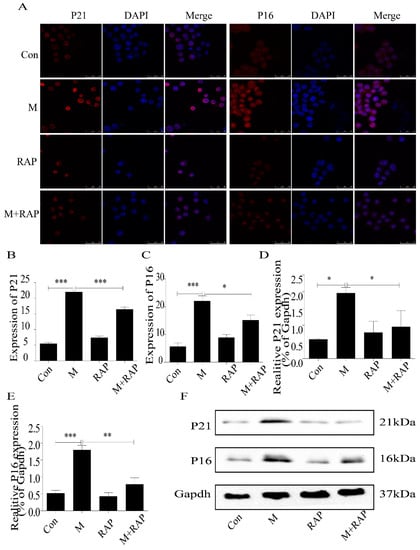 Expression of P21 and P16 in macrophage cells detected by immunofluorescence and Western blot. (A) Immunofluorescence. (B,C) Results of P21 and P16 immunofluorescence. (D,E) Results of P21 and P16 Western blot. (F) Western blot. Con, control; M, model; RAP, rapamycin; M + RAP, model + rapamycin. Data are presented as means ± SD, * p < 0.05; ** p < 0.01; *** p < 0.001.