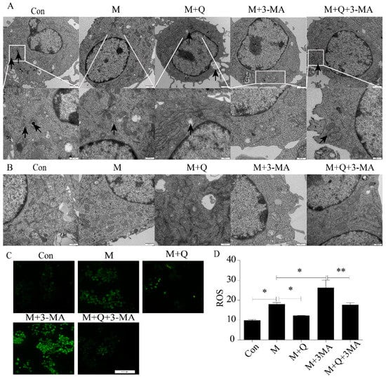 Quercetin delayed senescence by upregulating autophagy. (A) Autophagosomes labeled by arrow. (B) Cellular ultrastructure. (C) ROS. (D) Results of ROS, expressed by the average optical density value. id, lipid droplet. Con, control; M, model; M + Q; model + quercetin; M + 3-MA, model + 3-methyladenine; M + Q + 3-MA, model + quercetin + 3-methyadenine. Data are presented as means ± SD, * p < 0.05; ** p < 0.01.