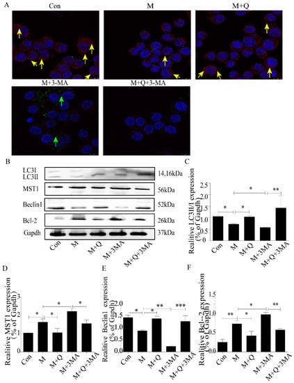 Quercetin regulated MST1-mediated autophagy. (A) Immunofluorescence of LC3 and P53, colocalization of P53 and LC3 labeled by yellow arrow, green arrows represented green fluorescent P53. (B) Western blot. (C–F) Expression of LC3-Ⅱ/Ⅰ, MST1, Beclin1, and Bcl-2. Con, control; M, model; M + Q; Model + Quercetin; M + 3-MA, model + 3-Methyladenine; M + Q + 3-MA, model + quercetin + 3-methyadenine. Data are presented as means ± SD, * p < 0.05; ** p < 0.01; *** p < 0.001.
