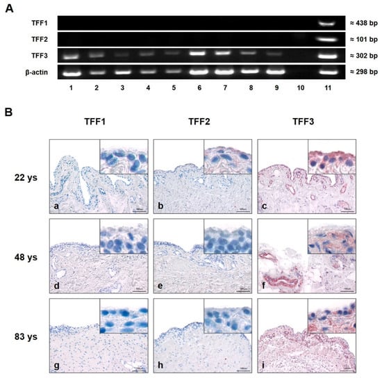 Presence and localization of TFFs in synovial membrane (SM). (A) Semi-quantitative PCR analysis of TFFs mRNA in human SM of five healthy (28, 48, 54, 78, and 92 years (Lines 1, 2, 3, 4, and 5)), rheumatoid arthritis (RA) (Lines 6 and 7) and osteoarthritis (OA) (Lines 8 and 9) samples. Line 10 represents the negative control (without cDNA template), and human stomach serves as positive control (Line 11). Beta-actin (β-actin) was used as the loading control. (B) Immunohistochemical analysis of TFF1, -2 and -3 in human SM of 22 (a,b,c), 48 (d,e,f), and 83 (g,h,i) year-old healthy donors. TFF3 is present in each examined sample (c,f,i). TFF1 (a,d,g) and TFF2 (b,e,h) reveal negative results irrespective of the donor’s age. Insets show magnifications. Scale bars: 100 μm. Red staining indicates positive antibody reaction.