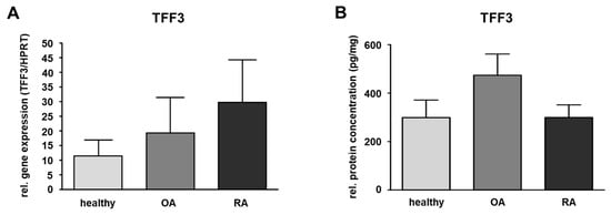 Although both diseases, OA and RA, show signs of synovial membrane inflammation, most studies that compared synovial membrane inflammation in OA and RA found higher expression levels of cytokines and a higher number of infiltrating immune cells in RA tissues [46]. Looking at the results of Rösler et al., who detected an induction of TFF3 gene expression due to stimulation of cultivated primary chondrocytes with TNFα and IL-1β [19], and considering the fact that TNFα and IL-1β are well known as important mediators of inflammation [47,48] it seems possible that this mechanism is the reason for the significantly higher level of TFF3 in RA synovial fluid.