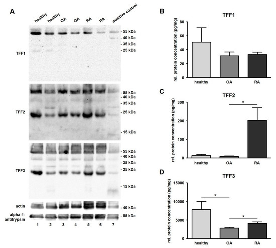 Detection and quantification of TFF peptides in synovial fluid (SF). (A) Western blot analysis of TFFs in human SF of healthy (Line 1 and 2), osteoarthritis (OA; Line 3 and 4), and rheumatoid arthritis (RA; Line 5 and 6) samples. Proteins of the human stomach serving as positive control (Line 7) were included in the test. Actin (≈ 43 kDa) and alpha-1-antitrypsin (≈ 51 kDa) were used as loading control. Molecular weight marker is shown on the right. ELISAs of TFF1 (B), –2 (C), and –3 (D) in human SF of healthy (n = 13), OA (n = 20) and RA (n = 20) samples. Mean values are: TFF1: 50.87 pg/mg (healthy), 31.16 pg/mg (OA), and 33.04 pg/mg (RA); TFF2: 13.69 pg/mg (healthy), 8.97 pg/mg (OA), 203.50 pg/mg (RA); TFF3: 7807.29 pg/mg (healthy), 2833.90 pg/mg (OA), 4083.92 pg/mg (RA). The protein concentration is expressed in pg/mg and visualized as mean value and standard error of the mean (SEM). * indicates significant differences performing the Mann–Whitney U-Test (significance level p ≤ 0.05).