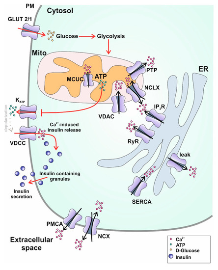 Schematic representation of glucose stimulated insulin secretion (GSIS) and subcellular Ca2+ dynamics in pancreatic β-cells. Ca2+ transporters within a pancreatic β-cell responsible for balancing Ca2+ homeostasis are the following: in the plasma membrane: PMCA: plasma membrane Ca2+-ATPase, NCX: Na+/Ca2+ exchanger; within the endoplasmic reticulum: SERCA: sarco/endoplasmic reticulum Ca2+-ATPase, RyR: ryanodine receptor, IP3R: inositol 1,4,5-trisphsphate receptor, VDAC: voltage dependent anion-selective channel; within mitochondria: NCLX: mitochondrial Na+/Ca2+ exchanger, PTP: permeability transition pore, MCUC: mitochondrial Ca2+ uniporter complex. Red arrows depict the process of glucose-stimulated insulin secretion. After uptake of glucose via GLUT2/1 mitochondrial ATP production is boosted leading to a closing of plasma membrane located ATP-sensitive K+ channels (KATP). The resulting shift in membrane potential activates PM voltage-dependent Ca2+ channels (VDCC) stimulating Ca2+-induced Ca2+ release which ultimately leads to exocytosis of insulin-containing granules.