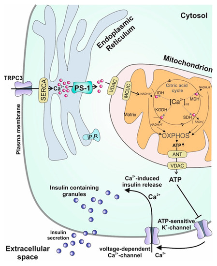 The above-mentioned ER Ca2+ depletion and subsequent ER Ca2+ stress can be explained—at least partially—by the existence of ER Ca2+ leak channels. Cassel and Ducreux [27] could show that translocon-mediated ER Ca2+ leak in murine MIN6 insulinoma β-cells and human islets is influencing lipotoxicity. Furthermore, translocon inhibition resulted in reduced ER stress and a restoration of insulin secretion [27]. Two recent studies of our group demonstrated that a presenilin-1-mediated ER Ca2+ leak crucially contributes to β-cell physiology and insulin secretion. The presenilin-1-mediated ER Ca2+ leak is directly sequestered by mitochondria, leading to increased basal matrix Ca2+ levels that yield enhanced resting activity of mitochondria in the pancreatic β-cells due to pre-stimulation the Ca2+-dependent dehydrogenases of the citric acid cycle. Upon elevation of glucose, glucose is metabolized and the pre-activated citric cycle in the mitochondria efficiently converts glucose metabolism to activation of the respiratory chain (OXPHOS) and, subsequently, fast ATP production, thus, ensuring a fast, initial insulin secretion within 10 min of exposure to elevated glucose [28,107].