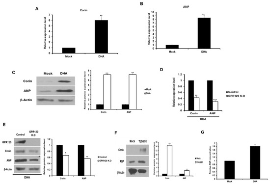 Corin and corin-activated ANP expression were investigated in the DHA-treated 3T3-L1 adipocytes and the GPR120-deficient cells to verify the expression of corin selected by RNA-seq. The mRNA levels of corin and ANP in the DHA-treated adipocytes were found to be significantly increased compared to the control cells (Figure 2A,B). The expression of corin and ANP protein was also found to increase in the DHA-treated cells. (Figure 2C). The treatment of GPR120 knock out adipocytes with DHA resulted in decreased mRNA and protein levels for corin and ANP compared to the control cells (Figure 2D,E). In addition, when TUG-891, a GPR120 agonist, was treated with 3T3-L1 adipocytes, the protein levels of corin and ANP were higher than those of the control group (Figure 2F). The expression of proprotein convertase subtilisin/hexin type 6 (PCSK6), a corin activator, was also investigated. PCSK6 is known to increase mature ANP secretion [23]. As shown in Figure S2, PCSK6 expression was increased in the adipocytes treated with DHA than in the control cells. We determined the amount of ANP secreted by the DHA-treated cells. As a result, a 2-fold increase in ANP secretion was found in the cell line treated with DHA compared to the control group (Figure 2G). These results indicate that the expression and secretion of ANP increase via the GPR120 pathway in DHA-treated cells.