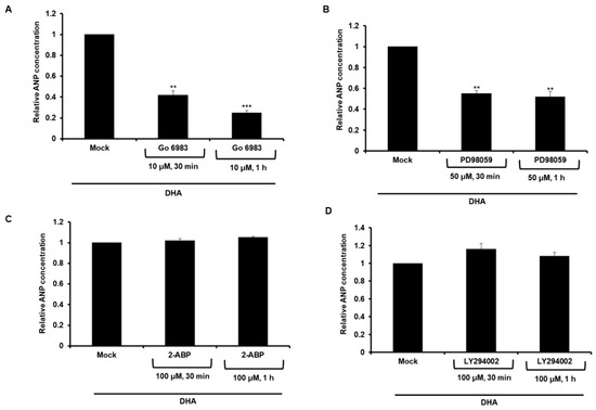 ANP secretion was mediated by the PKC/ERK 1/2 signaling pathway in DHA-induced adipocytes. 3T3-L1 cells were exposed to DHA (100 μM) for 2 d in the presence of the differentiation medium. (A–D) 3T3-L1 adipocytes were treated with DHA in the presence of (A) PKC inhibitor Go 6983, (B) ERK inhibitor PD98059, (C) Ca2+ signaling inhibitor 2-ABP, or (D) PI3K inhibitor LY294002. The concentration of ANP in the media of adipocytes was measured by ELISA. ** p < 0.01, *** p < 0.001. Bars are means ± standard deviations of three independent experiments.