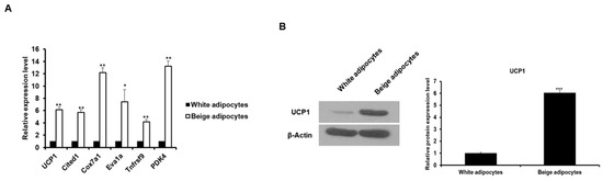 3T3-L1 cells differentiated into beige-like adipocytes in the presence of T3 and rosiglitazone. (A) The expression of brown/beige adipocytes-specific genes was determined by qRT-PCR in white adipocytes (mature 3T3-L1 adipocytes) and beige adipocytes (3T3-L1 adipocytes exposed to T3 and rosiglitazone). The basal delta-Ct levels for tested genes are presented as Supplementary Table S3. * p < 0.05, ** p < 0.01. (B) The expression of UCP1 in white adipocytes and beige adipocytes was analyzed by Western blotting. The level of UCP1 protein was used as a marker for beige adipocytes. *** p < 0.001. The data are shown as the means ± standard deviations of three independent experiments.