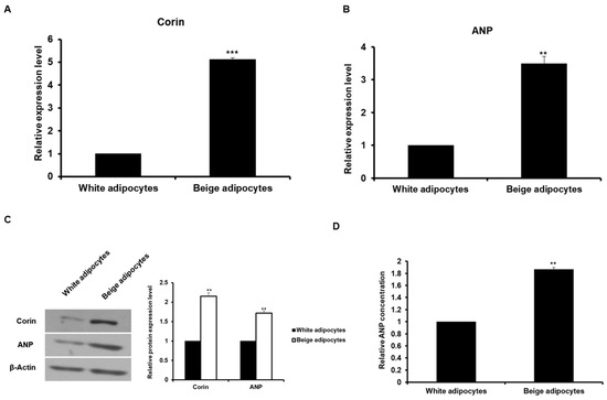 Corin, a transmembrane serine protease, is mainly distributed in the heart, kidney, and bone [12,13]. It is responsible for converting inactive pro-atrial natriuretic peptide (pro-ANP) into the active form of ANP [14]. The tissue expression patterns of corin and natriuretic peptides are very similar [15]. Activated ANP is a peptide hormone consisting of 28 amino acids that binds to NPR1, a receptor in target organs such as the kidneys and peripheral blood vessels, converting intracellular GTP into cGMP to promote the excretion of Na+, inhibit Na+ reuptake, and induce vasodilation [16,17]. Recently, ANP was found to act on adipocytes to increase mitochondrial biogenesis and UCP1 gene expression, inducing heat generation by converting adipocytes into beige fat [18,19]. Although ANP expression and secretion are known to occur mainly in the heart [20,21], it has been reported that ANP gene expression also occurs in adipocytes [22]. When ANP genes were expressed in human preadipose immortalized (Chub-S7) cells and differentiated Chub-S7 adipocytes, ANP expression was not expressed in differentiated adipocytes, although ANP expression and secretion was observed in preadipocytes. There does not currently exist any studies on ANP expression and secretion in beige adipocytes. As such, in this study, we investigate whether ANP expression and secretion occurs in beige adipocytes.