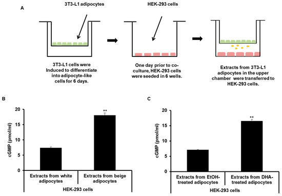 For the co-culture experiments, 0.4 μm pore size transwell chambers (Corning Inc., Corning, NY, USA) were used to avoid direct contact between 3T3-L1 adipocytes and HEK-293 cells. 3T3-L1 cells were added in the upper chamber of a 6-well plate and were differentiated with DHA or differentiation reagents. Two days before the cGMP assay, HEK-293 cells were seeded in a 6-well plate at a density of 2 × 105 cells per well, rather than in plates with 3T3-L1 cells. The differentiated 3T3-L1 cells in the upper chamber were transferred to a plate with the HEK-293 cells. After 3T3-L1 and HEK-293 cells were co-cultured for 24 h, the HEK-293 cells were harvested. HEK-293 cells were analyzed cGMP activity using the parameter cGMP immunoassay (R&D systems, Minneapolis, MN, USA) according to the protocol provided by the manufacturer.