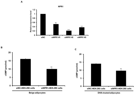 We investigated whether ANP secreted from beige-like adipocytes acted on recipient cells. Renal cells are known to have an ANP receptor NPR1. HEK-293 cells were cultured in 6-well plates, then transwell inserts with beige-like adipocytes were placed on them for 24 h, as shown in Figure 6A. Beige-like adipocytes were induced by treatment with T3 and rosiglitazone or DHA. After co-culturing, HEK-293 cells were collected and examined for the levels of cGMP as a secondary messenger. As a result, the levels of cGMP were found to be increased in HEK-293 cells co-cultured with beige-like adipocytes compared to HEK-293 cells co-cultured with white adipocytes (Figure 6B). In addition, the concentration of cGMP was increased in HEK293 cells co-cultured with the DHA-treated adipocytes compared to HEK293 cells co-cultured with the BSA-treated adipocytes (Figure 6C). Next, co-cultures with both beige-like adipocytes and HEK-293 cells expressing knocked-down NPR1, an ANP receptor, were performed to determine whether the increased concentration of cGMP in HEK-293 cells resulted directly from the ANP secreted by the adipocytes. Firstly, several NPR1 siRNAs were constructed to investigate which one was the most efficient siRNA oligo for decreasing NPR1 expression in HEK-293 cells. siNPR1 # 2 was found to significantly decrease the expression of the NPR1 gene and was used for the subsequent experiment (Figure 7A). NPR1 knocked-down HEK-293 cells were co-cultured with adipocytes treated with T3 and rosiglitazone, resulting in decreased cGMP concentrations compared to the controls (Figure 7B). NPR1 knocked-down HEK-293 cells incubated with DHA-treated adipocytes also showed lower levels of cGMP than the controls (Figure 7C).