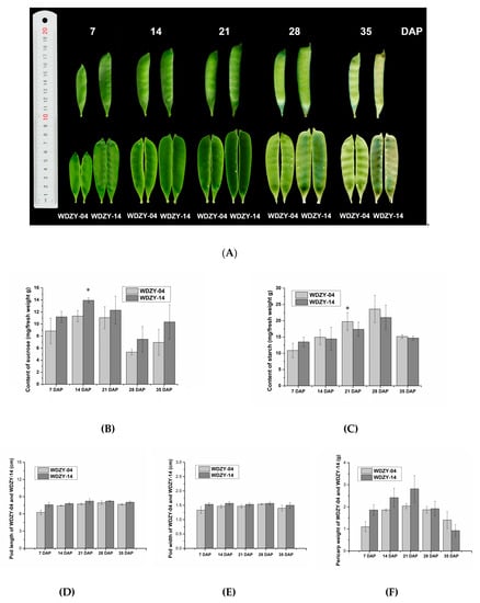 The morphology of the pea pericarp at different developmental stages and pea pericarp size measurement. (A) The pod and pericarp of grain pea (WDZY-04) and vegetable pea (WDZY-14) at 7, 14, 21, 28, and 35 days after pollination (DAP). (B) Comparison of the sucrose contents in two pea cultivars at five developmental stages. (C) Comparison of the starch contents in two pea cultivars at five developmental stages. (D–F) The length, width, and fresh weight of the pea pericarp at five developmental stages, respectively. The measurement data are shown with standard error bars from three repeated experiments. The data are the means ± SE (n = 3). * Denotes a significant difference at p < 0.05 (T-test).