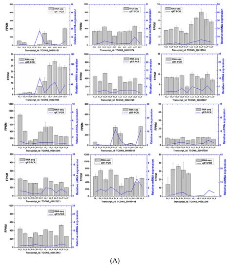 A total of 13 genes were selected to validate the RNA-seq data. The HiScript® II Q RT SuperMix for qPCR (+g DNA wiper) Kit (Nanjing, China) was used according to the manufacturer’s instructions to generate the first cDNA after extracting the total RNA from six samples subjected to RNA-seq. The gene-specific primers were produced by Primer 5.0 software (Premier, Canada), and the primer sequence is listed in Table S4. The gene-specific primer was synthesized by Sangon Biotech Co., Ltd. (Shanghai, China). ChamQTM SYBR® Color qPCR Master Mix (10 μL; Vazyme, Nanjing, China) was mixed with gene-specific primers, sterilized water, and the synthesized cDNA, with 20 μL as the total reaction volume. The reaction were performed on an qTOWER 2.2 (Analytik Jena AG, Jena, Germany). The two-step quantitative RT-PCR program began at 95 °C for 30 s, followed by 40 cycles of 95 °C for 10 s and 60 °C for 30 s. Each reaction was carried out with three biological replicates and three technical replicates. Tubulin was used as the internal reference gene. The data were analyzed using the 2−ΔΔCt method to obtain relative mRNA expression data.