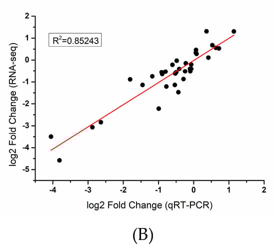 Moreover, a coverage analysis of the genes and an assessment of the sequencing randomness were conducted in our study to evaluate the quality of the sequencing. Each clean read for each sample was evenly distributed in the gene body (Figure S3). Meanwhile, Pearson’s correlation analysis was performed to evaluate the reproducibility of the biological replicates. As shown in Figure S4, the correlations between samples among the same biological replicates were good, with a value ranging from 0.91 to 1.000. However, the correlations between samples of the biological replicates varied significantly, with a value ranging from 0.04 to 0.88. Meanwhile, qRT-PCR analysis was used to validate the quality of the RNA-seq data. A total of 13 genes were selected. As expected, most of these candidate genes had similar expression tendencies (Figure 2A). While the exact change did not exactly match that of the others, the expression trends of all genes from the qRT-PCR and RNA-seq analyses were largely consistent (Pearson’s correlation coefficient, R2 = 0.85) (Figure 2B). The strong correlation between the RNA-seq and qRT-PCR data indicates the reliability of the transcriptomic profiling data.