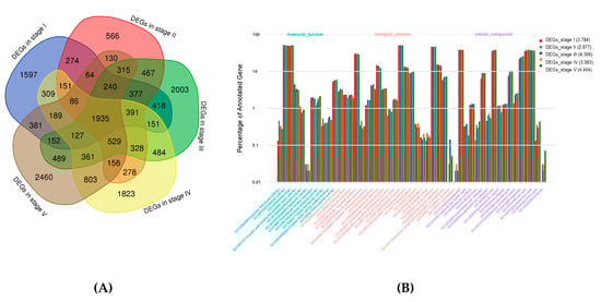 Venn diagram of DEGs and the GO annotation of DEGs in the five compared groups. (A) Venn diagram of the number of DEGs in different development stages. (B) The GO annotation of DEGs in the different developmental stages.