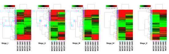 In order to understand the expression pattern of DEGs in the five stages for the two cultivars, we conducted hierarchical clustering for the DEGs for the five compared groups (Figure 4). The differentially expressed genes in the five groups were mainly classified into high-expression genes (red) and low-expression genes (green). We grouped genes with a similar expression pattern into a set and used six, five, four, four, and three model profiles to summarize the expression pattern of this subcluster of genes. The DEGs in the five groups fluctuated obviously (more expressed or lower expressed). The expression pattern of the sub-cluster genes in each group is shown in Figure S5.